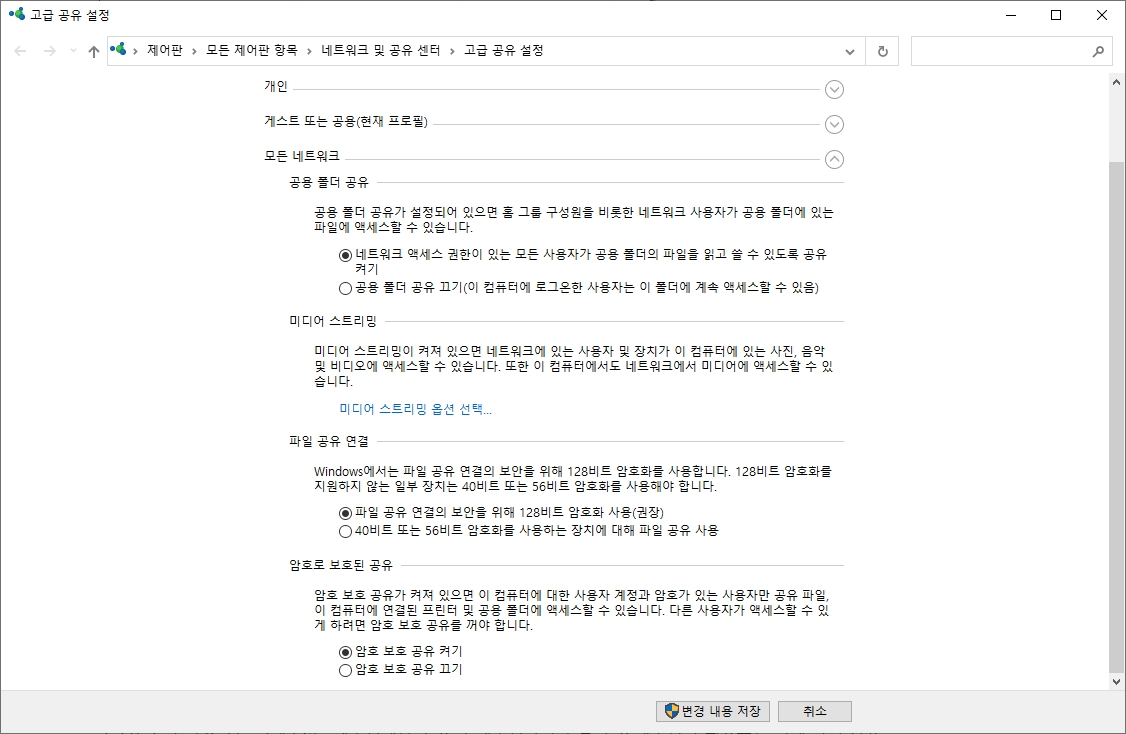 공유 센터 창이 열리면 아래 이미지와 동일하게 설정하도록 한다.
