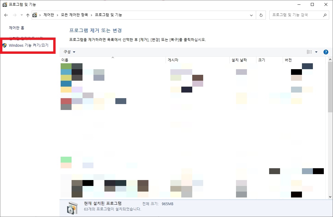프로그램 및 기능 창이 열리면 왼쪽에 있는 Windows 기능 켜기/끄기를 클릭한다.
