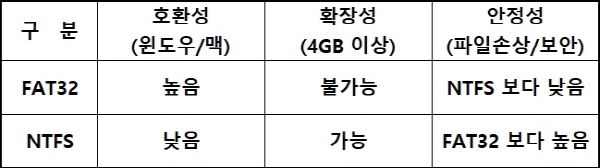 NTFS는 FAT32보다 안정적이고 보안성에서 장점이 있지만, 작은 볼륨에서의 액세스 속도는 다소 느리고, NTFS로 포맷된 저장장치를 인식하지 못해 운영체제와 호환성이 떨어지는 단점이 존재한다. NTFS는 4GB 이상의 파일을 저장해야 하는 저장 장치와 일반 Windows 사용자에게 적합하다.